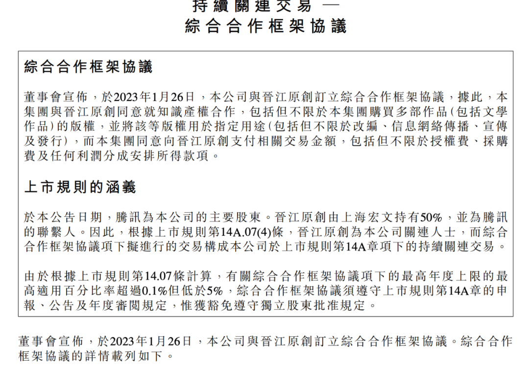 1月26日,B站发布公告称,其与晋江原创达成合作框架协议,两者将就知识产权合作,包括但不限于B站购买晋江多部作品的版权,并将该版权用于指定用途。而B站同意向晋江原创支付相关交易金额,包括但不限于授权费、采购费及任何利润分成安排所得款项。