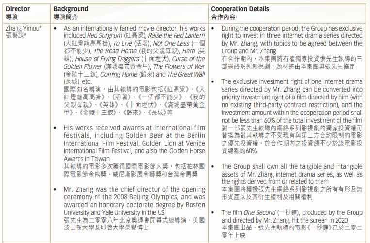 2018年,欢喜传媒与张艺谋签下六年之约,欢喜传媒拥有对张艺谋执导的三部网络系列影视剧的独家投资权,并可将其中一部替换为电影项目。到2024年,初始六年合作期限过后,双方合作可进一步延长四年。