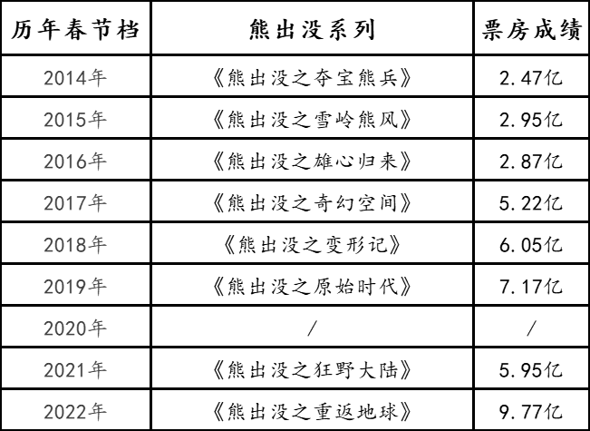 从2014年第一次登上大荧幕算起,《熊出没》系列电影便成为了春节档熟面孔,今年的春节档打破了去年的票房纪录,而《熊出没》系列累计票房已经突破50亿,成为中国首个破50亿的动画系列电影。