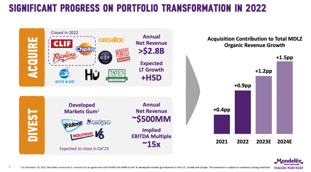 对比起要卖掉的部分业务,亿滋“买买买”的记录更为瞩目。自2018年以来,该公司已进行九笔收购,这些业务去年共贡献了0.9个百分点的有机收入增长,贡献率有望逐年上升至2024年的1.5个百分点。