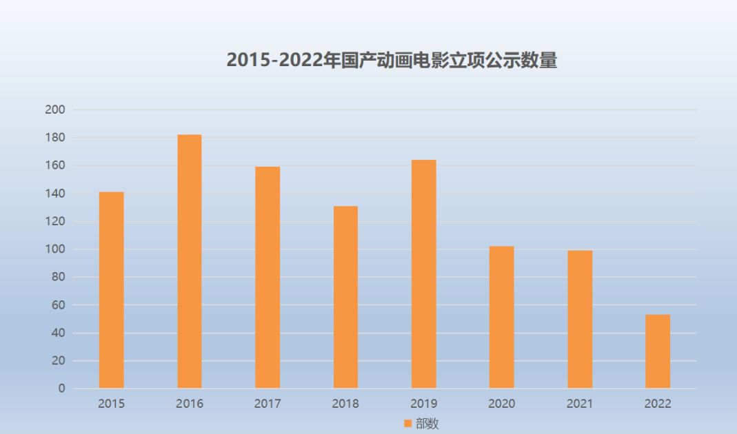 2015-2022年,国产动画电影立项公示的部数,分别为141、182、159、131、164、102、99、53。