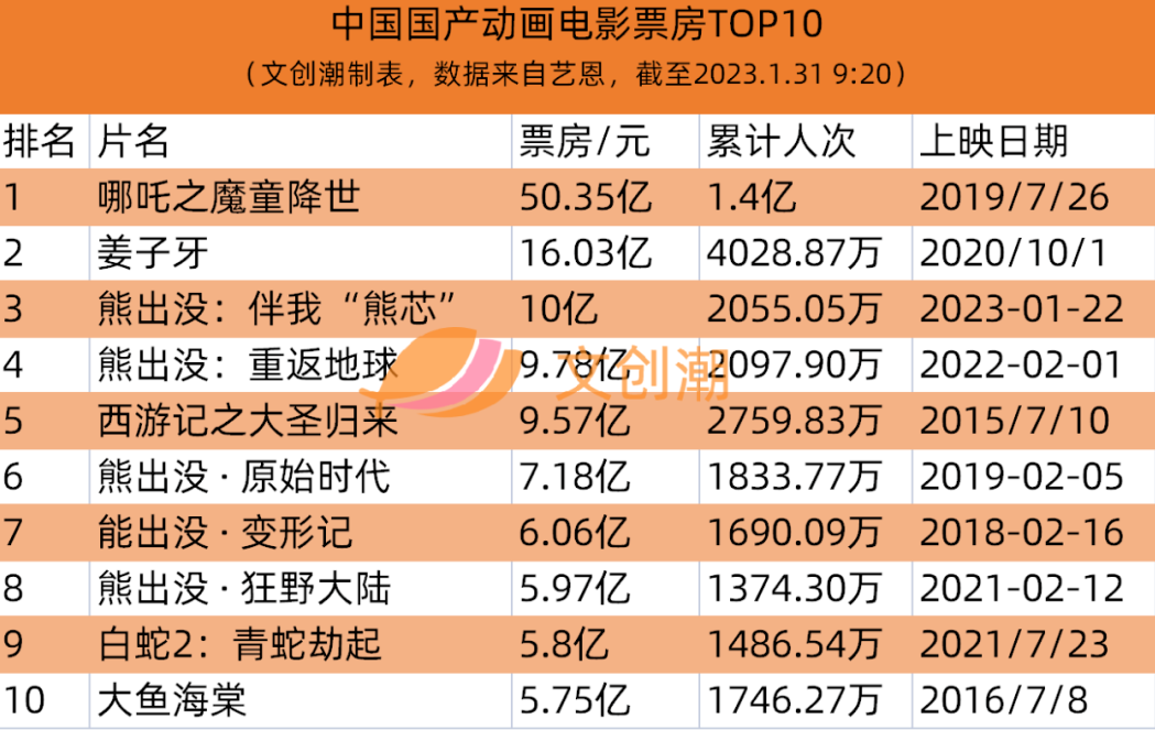 其中方特动漫的《熊出没·伴我“熊芯”》2023大年初一上映,票房已经突破10亿元。
