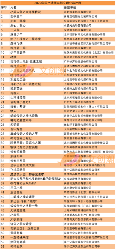 至此,2022年度在国家电影局备案的国产电影项目都已公示,其中动画电影53部。