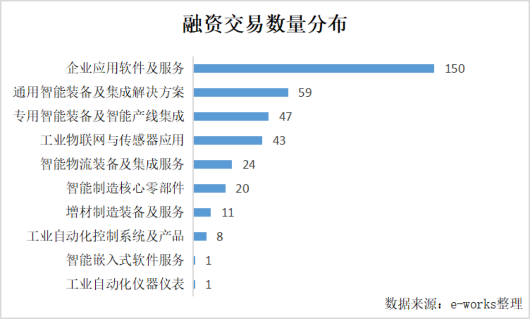 在融资金额方面,IPO融资约达352.18亿元,战略融资约为21.29亿元,股权融资约为2.2亿元,定向增发融资约为2.15亿元;其中企业应用软件及服务、通用智能装备及集成解决方案、专用智能装备及智能产线集成领域的融资金额较多,分别占总体的34%、21%和12%。