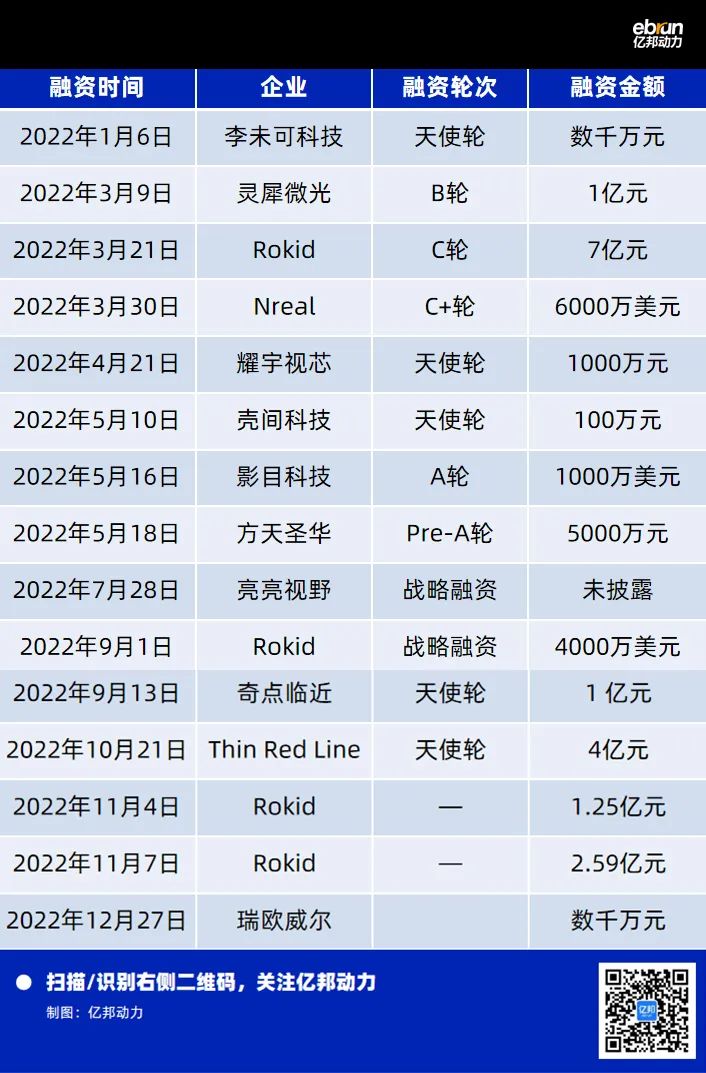 2022年我国AR/VR产业共有158家企业融资,已披露金额高达21.58亿美元。其中的AR硬件主要融资如下: