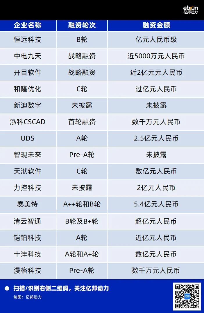 在设计软件方向,CAD也备受重视。据亿邦动力不完全统计,2022年共有15款工业设计软件获得融资,融资总额超22亿元人民币。