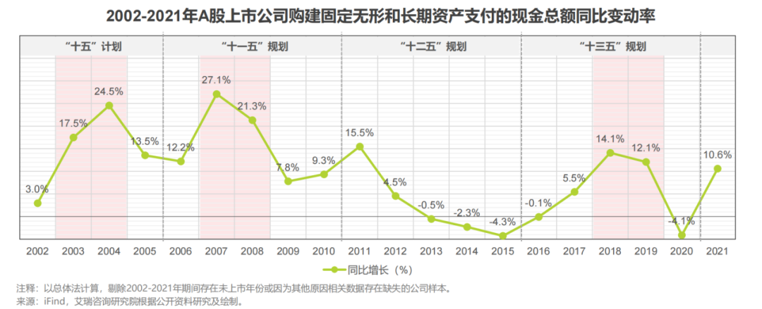 艾瑞咨询测算A股大型企业财务报表中的“购建固定无形和长期资产支付的现金”一项,如下图,大型企业的投资周期与五年规划为代表的政策周期存在一定关联。