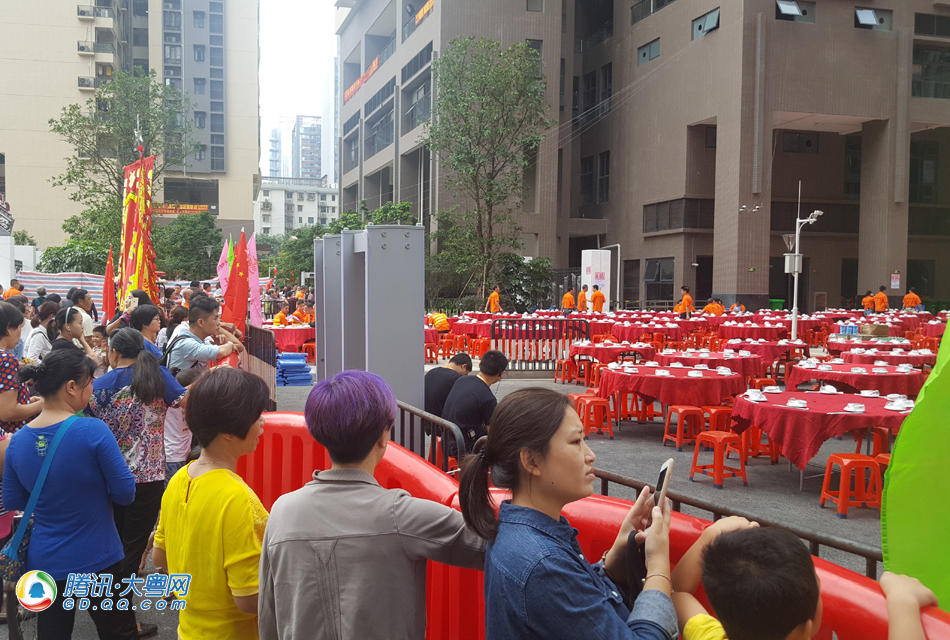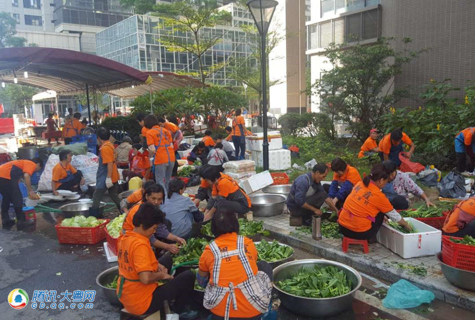 筹备现场,围着小区走,每拐个大弯就能轻易能看到一“堆”橙色在忙活。据了解,这“堆”橙色是今天千围宴最庞大的餐厨后勤队。“我们来了600号人,开了好几辆大巴,从顺德出发,早上6点到了就直接开工了。”该餐饮策划的相关工作人员说,现场搭建了六个“厨房”,其中三个专门明火做热食的在最里面。