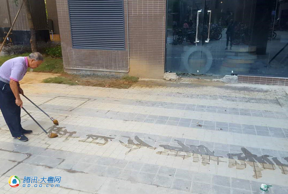 家住杨箕小区的李伯平日就喜欢作作对联,今天早上,他带着自己编好的对联到楼下空地挥洒了起来。李伯说,他现在住的是小户型,家里地方窄没地儿练大笔,趁着回迁之喜,又是国庆,就自己DIY了两管“大毛笔”到楼下来写写对联,“给回迁贺贺喜”。图为李伯用自制的“海绵毛笔”在写对联。