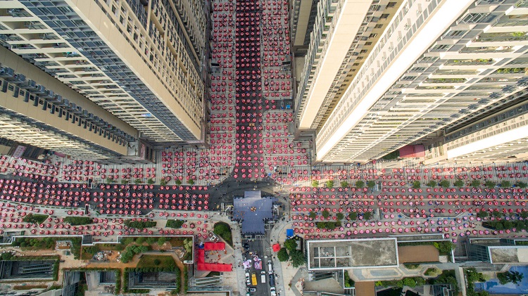 10月2日下午5点,杨箕回迁入伙千围宴庆典将在杨箕小区内举行。历经7年,杨箕村终于完成改造,当年1496栋被拆迁房屋的回迁人再回到这里,姚李秦梁四大家族同聚共庆这一大盛事。图为杨箕小区内,街道上摆满了喜庆的大红桌。