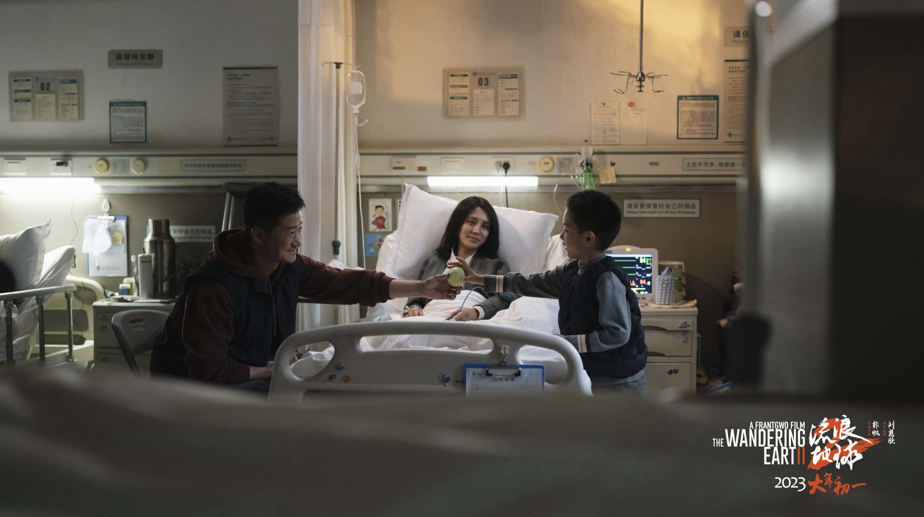与母亲缺失的小家形成对照的,是人类牺牲月亮的集体行动,这两个叙事彼此交织嵌套。太阳危机使得太阴所代表的孕育绵延与温情滋养弱化甚至消失,我们会对影片中佟丽娅饰演的母亲角色出场时间如此短暂感到惊奇,她在笑着跟女儿聊天时就被飞来横祸夺走生命,她与图恒宇的结婚照也在图专心研究时被挪走;而朵朵作为母亲大多数时间躺在病床上,处于被照顾的状态,她的格斗本领派不上用场——除了让她与刘培强相知相识相恋,她的依恋也将成为家人的负累。