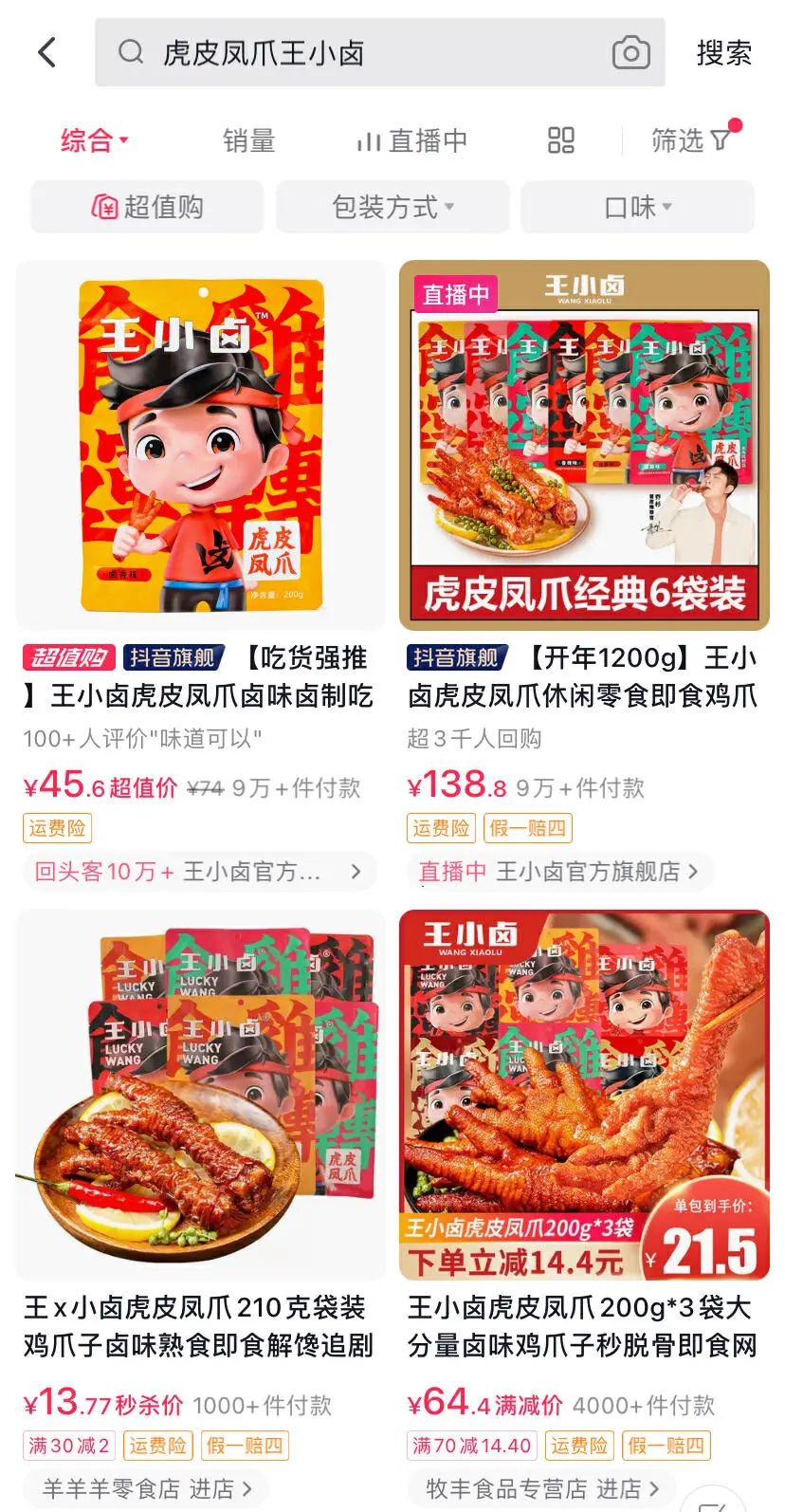 DataEye研究院电商组通过比较发现,达人带货的商品多为组合包装,抖音超市多为1袋。哪怕是同一件商品,规格也不一样。以“王小卤虎皮凤爪”为例:抖音超市200g*1袋为23.8元,而此前抖音达人小贝带货400g*2+虎皮凤爪200g*1(共1000g)价格为99.9元,折算下来,达人带货价格比抖音超市便宜。