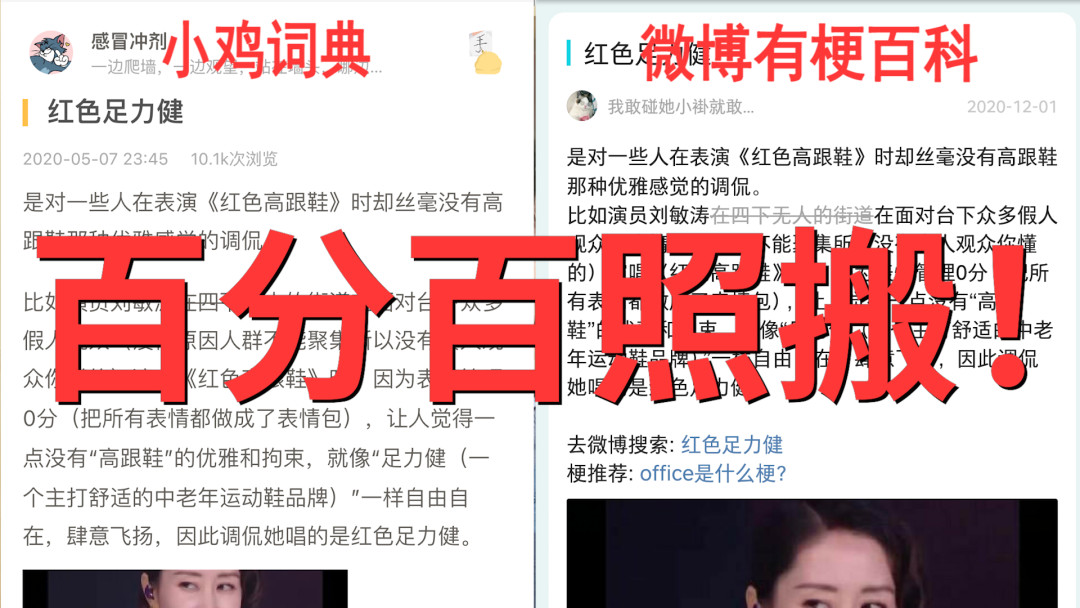 小鸡词典表示,截止2021年6月2日,有梗百科中一共有将近3万条内容,其中,2万1千多条都是直接从小鸡词典直接百分百照搬的。