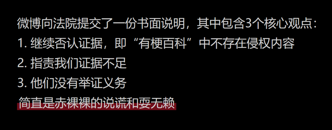但微博对这种事的处理非常老道,在打官司之前,直接把有梗百科直接下线了。然后在法庭上,以小鸡词典提供数据是虚假的为由,否定了小鸡词典的证明过程。