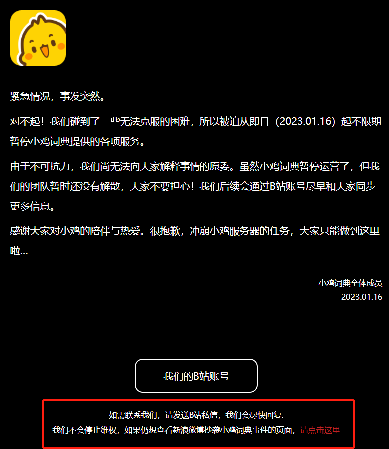 那么是微博把小鸡词典给搞倒了吗?虽然长期打官司自然要花不少钱,但小鸡词典并没有这么说。而在B站的官方视频中有提到,“一个电话就可以让我们8个人一整年的努力化为一场空”。