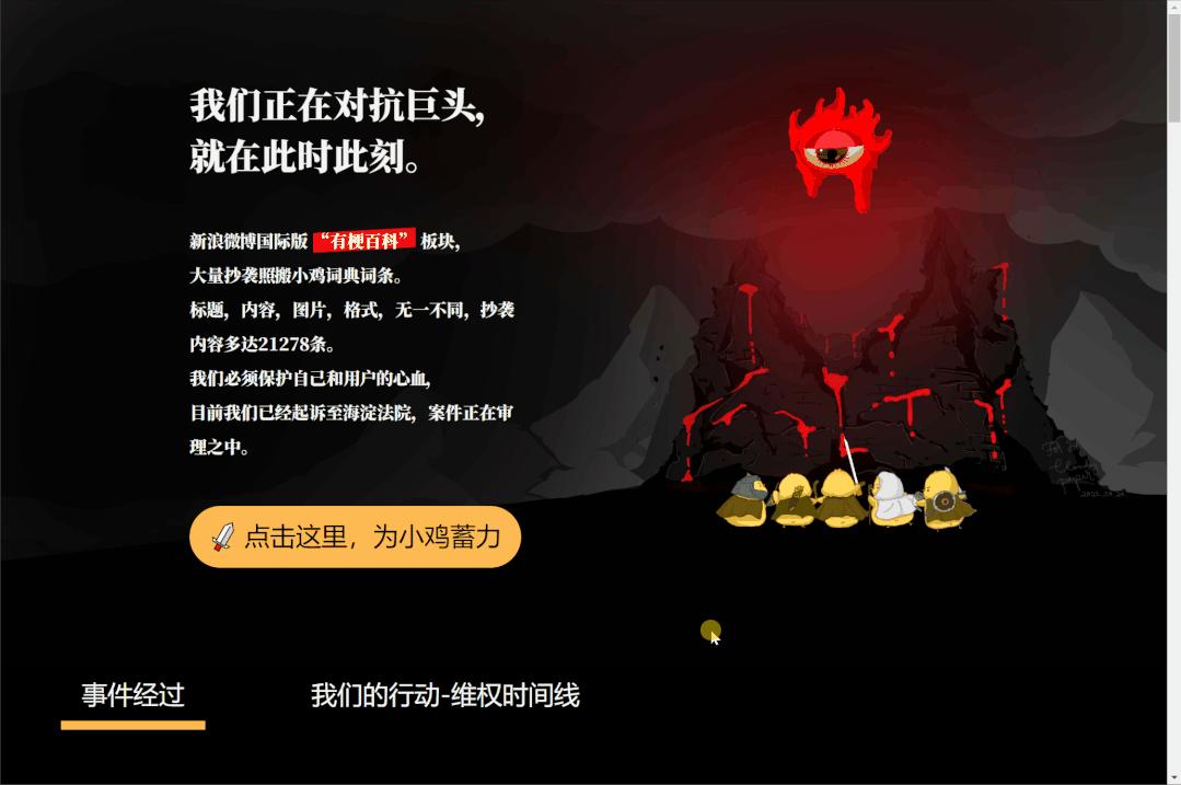点击链接后映入眼帘的是一群小鸡在对抗微博Logo的画面,标题也很有冲击力:我们正在对抗巨头,就在此时此刻。下面则是按时间线发布的事情动态。