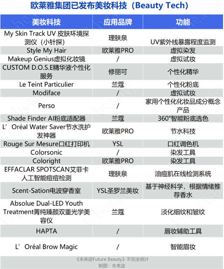 据《未来迹Future Beauty》不完全统计,截至目前,欧莱雅集团先后推出二十余款美妆科技产品,涵盖从护肤到彩妆多领域、从肌肤检测到试妆、个性化服务、辅助上妆等多个层面,布局十分全面。