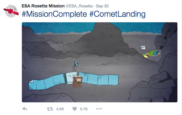 Twitter上,欧洲航天局用32种语言奔走相告这个喜讯,同时也用了一组漫画来回顾罗塞塔的12年“追星”之旅,还有一部萌萌哒的动画短片。最后一张回顾漫画得到了5700个赞和4500次转发。
