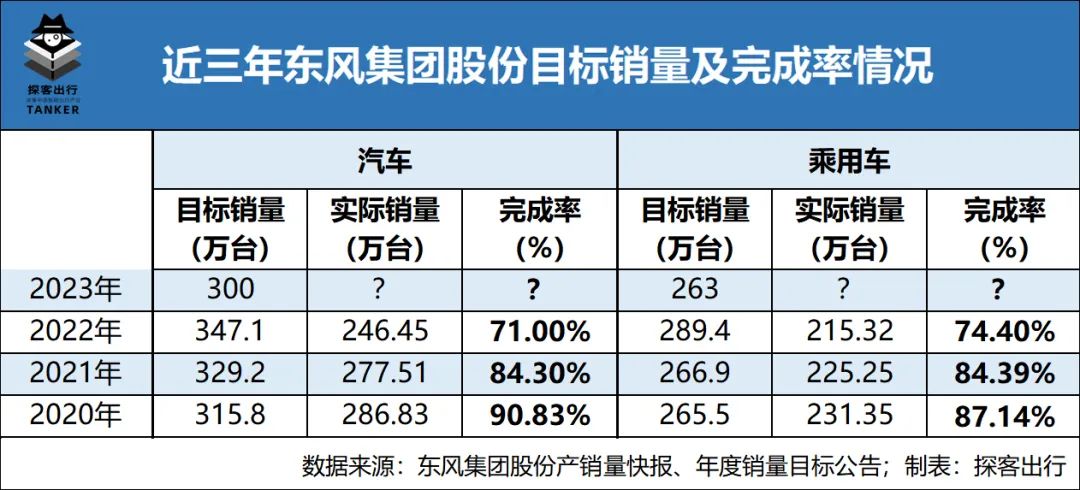 对于东风集团的“过度自信”,「探客出行」整理东风集团过去三年的汽车销量发现,预期目标是逐年攀升,实际销量却逐步下降,目标完成率也从2020年的90.83%下降至2022年的71.00%。