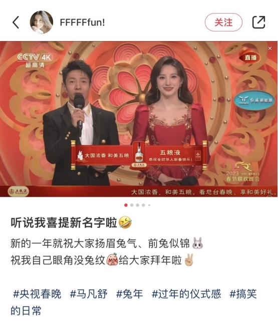 诸多关于春晚的吐槽中,有一条是关于五粮液广告的。不少网友戏称,“喜欢这个叫五粮液的主持人”,还有不明真相的群众疑惑,“这年头姓五的不多啊”。