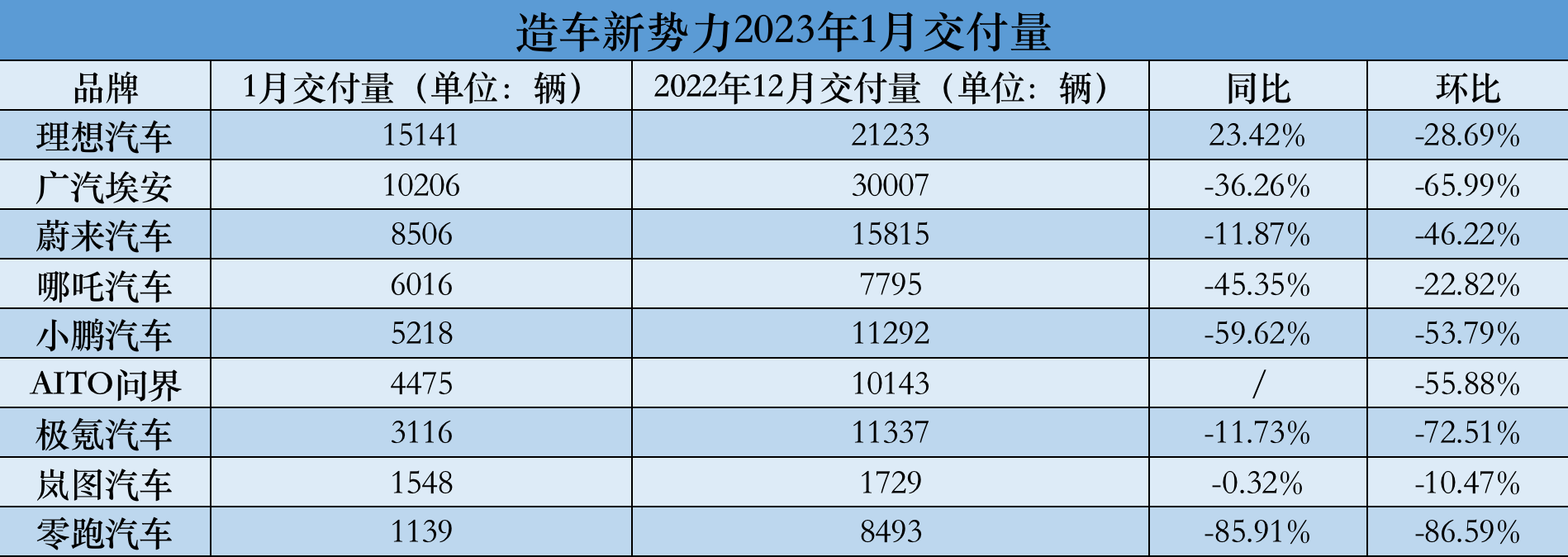 2月1日,造车新势力1月交付成绩陆续出炉。受春节假期影响,新势力们的1月交付成绩普遍不理想,相较去年12月均出现了环比下滑的现象,同比交付也多有下降。1月份,仅理想汽车、广汽埃安实现了月交付过万。