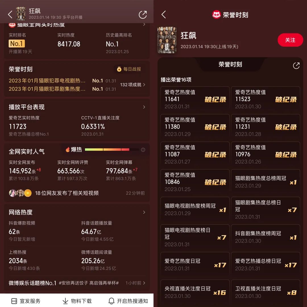 据猫眼专业版数据,截至2月1日22时,剧集收官前夕,《狂飙》在爱奇艺上的热度值创下了平台新高后,又6次自我刷新了最高热度值,峰值一度达到11641。与此同时,该片在央视直播关注度、卫视直播关注度方面分别获得了16个和8个日冠。话题#狂飙#在微博的阅读量更是高达205.26亿。