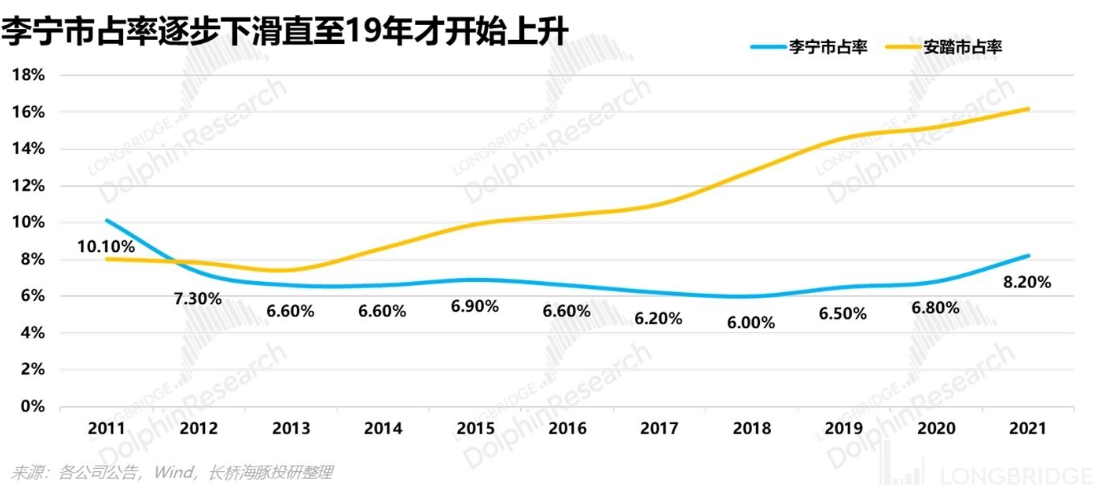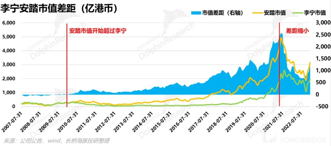 近二十年竞争格局的变化,可以说凡是李宁放弃的,皆是安踏得到的。对手高歌猛进,逐步和自己起鼓相当,此时李宁已经失去太多。