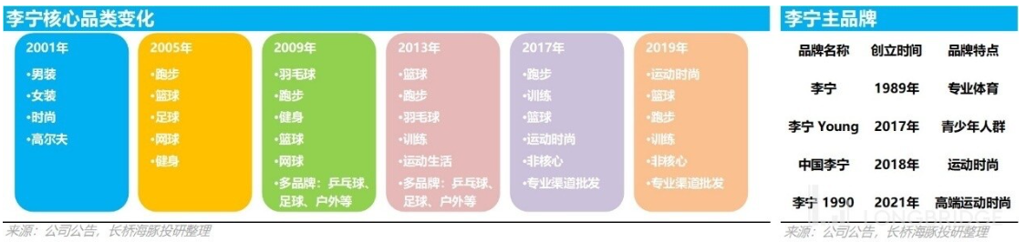 从创立以来,李宁在自己的品牌及品类发展方面曾经做过几次调整。2006-2009 年,集团也采用过多品牌策略,并且并购了多种运动品类。这是一段弯路,在经历库存危机之后,公司剥离与品牌价值不符的业务,最终形成 “单品牌、多品类、多渠道” 的公司战略。