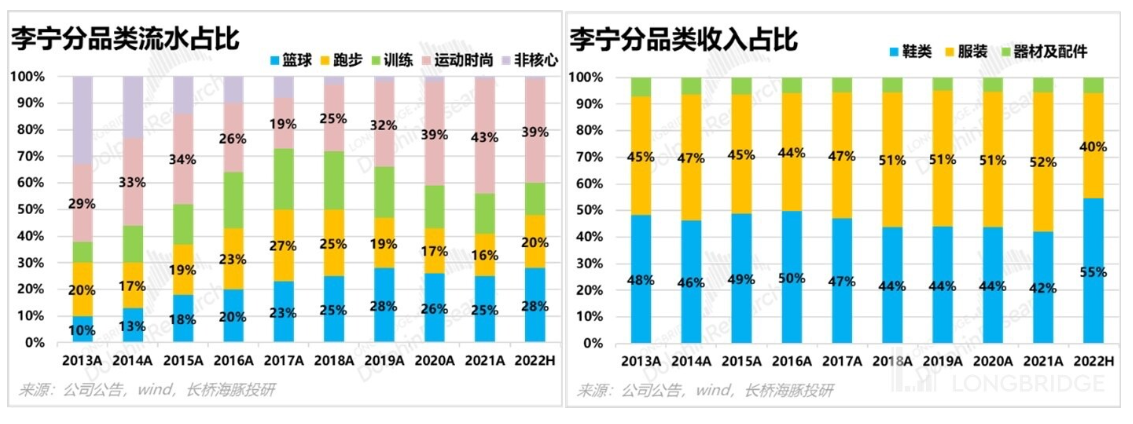 关于李宁的设计感,在篮球鞋这一块的表现尤为突出。过去十年,公司篮球类的产品在分品类流水占比当中从一成提成至近三成,这就不得不提到李宁的两大高端系列产品——韦德之道和驭帅。