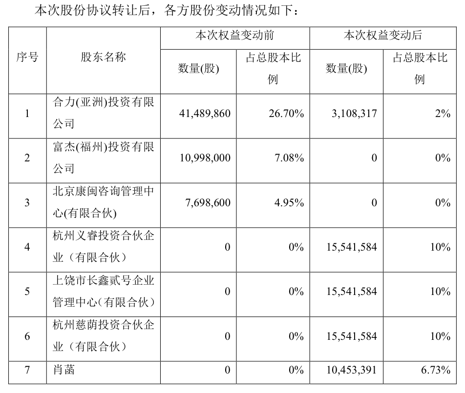 进一步看,绿康生化或在下一盘大旗,上述对江西纬科的收购,以股份转让(合力(亚洲)投资有限公司、富杰(平潭)投资有限公司、北京康闽咨询管理中心(有限合伙)协议转让合计36.73%股份,受让方为杭州义睿投资合伙企业(有限合伙)、上饶市长鑫贰号企业管理中心(有限合伙)、杭州慈荫投资合伙企业(有限合伙)、肖菡)和资产置出(福建浦潭热能有限公司100%股权)为前提。目前福建浦潭热能有限公司已经办理完成置出,公司不再持有其股份。另外,36.73%股权转让的事项已办理完成过户登记手续。