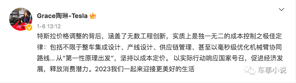 在汽车生产销量体系中,价格制定往往是最为敏感也是最为复杂的一个环节。在价格调整后,特斯拉对外事务副总裁陶琳就曾公开表示:“特斯拉价格调整的背后,涵盖了无数工程创新,实质上是独一无二的成本控制之极佳定律:包括不限于整车集成设计、产线设计、供应链管理、甚至以毫秒级优化机械臂协同路线…… ”
