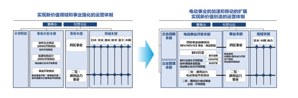 此次成立的电动事业开发本部将主要负责汽车事业战略及纯电动产品开发、摩托和其他动力产品的事业战略和车型开发。新设的企业战略本部和企业管理本部着重企业战略联动和优化整体经营资源。