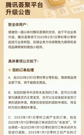 官方公告显示,腾讯荟聚将于2023年2月1日进行业务转型,后续业务方向将聚焦推荐和发现品牌商家的微信小程序。这也意味着,腾讯荟聚将从货架电商交易平台转型为品牌推荐平台。