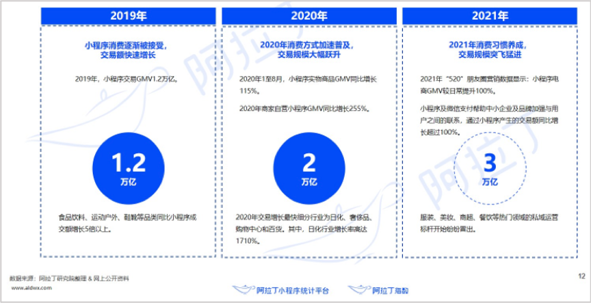 阿拉丁研究院披露的数据显示,2019年,微信小程序GMV快速增长,达到了1.2万亿元;2020年交易规模进一步攀升,商家自营小程序GMV达到了2万亿,同比增长255%;2021年微信小程序电商GMV增长超100%,预计达3万亿。