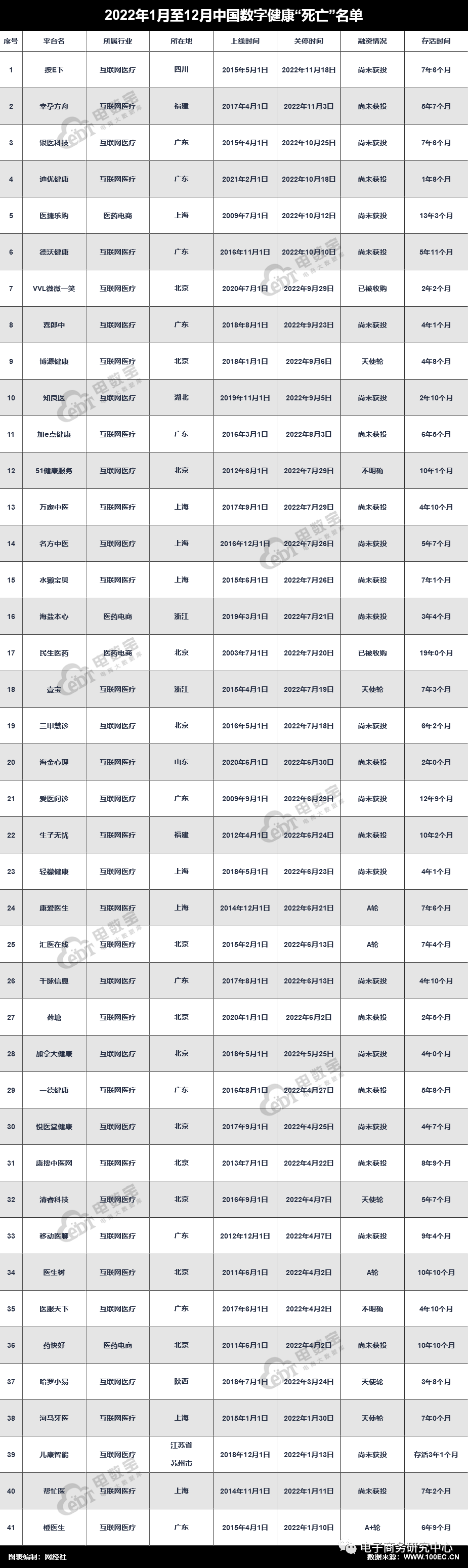 据网经社旗下“电数宝”(DATA.100EC.CN)电商大数据库显示,2022年数字健康公司“死亡”数41家,分别为:按E下、幸孕方舟、银医科技、迪优健康、医捷乐购、德沃健康、VVL微微一笑、喜郎中、博源健康、知良医、加e点健康、51健康服务、万家中医、名方中医、水獭宝贝、海盐本心、民生医药、壹宝、三甲慧诊、海金心理、爱医问诊、生子无忧、轻檬健康、康爱医生、汇医在线、千脉信息、荷塘、加拿大健康、一德健康、悦医堂健康、康搜中医网、清睿科技、移动医聊、医生树、医服天下、药快好、哈罗小易、河马牙医、儿康智能、帮忙医、橙医生。(注:本数据库定义的“死亡”包括公司破产、倒闭、重大重组、工商注销、创始人跑路、平台关停或停更等)