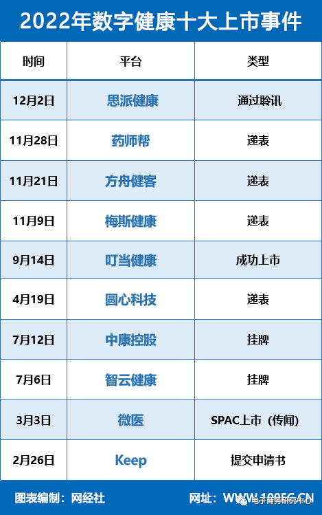 2022年数字健康行业迎来上市潮。思派健康通过聆讯,药师帮、方舟健客、梅斯健康、圆心科技、Keep纷纷等递表,叮当健康成功上市。