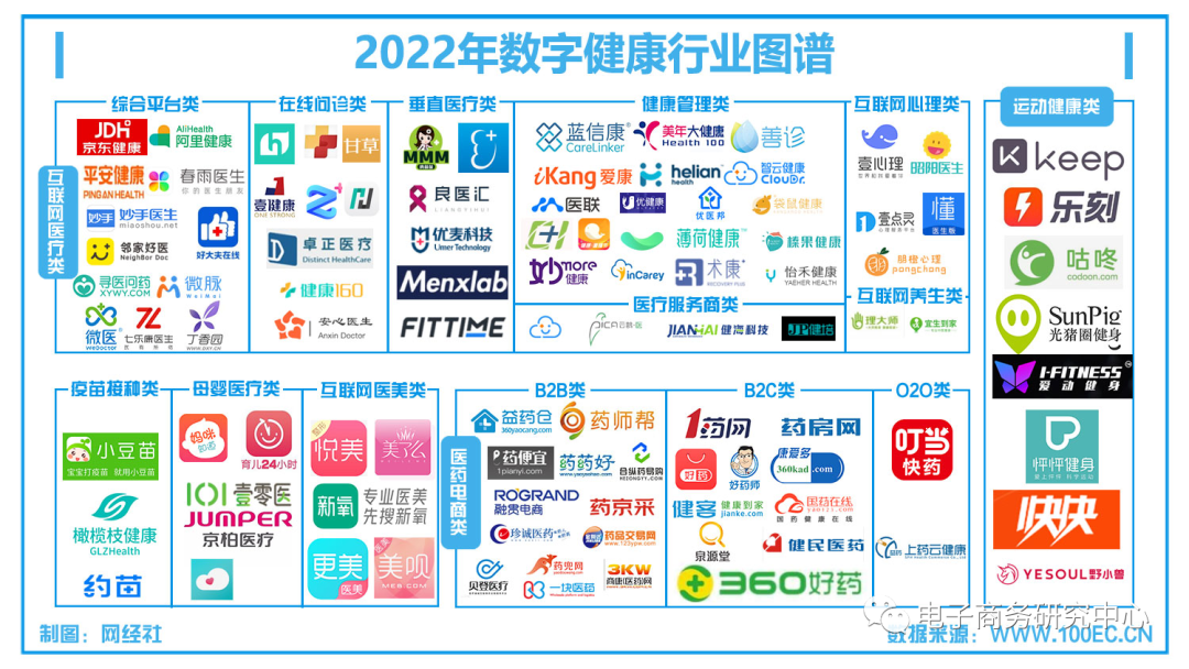 据网经社企业库(COP.100EC.CN)显示,其主流平台包括:(1)综合平台:京东健康、阿里健康、平安健康、微脉、丁香园、微医等;(2)在线问诊:小荷、安心医生、卓正医疗等;(3)健康管理:亿家健康、善诊、薄荷健康、榛果健康、妙健康、袋鼠健康等;(4)医疗服务商家:智云健康、云鹊医、健海科技、健培科技等;(5)垂直医疗:康健苗苗、良医汇、掌上肾医、优麦科技、睿健时代等;(6)互联网医美:新氧、美呗、悦美、更美、美了么等;(7)母婴医疗:妈咪知道、育儿24小时、京柏医疗等;(8)疫苗接种:小豆苗、约苗、橄榄枝健康等;(9)互联网心理:壹心理、壹点灵、朋橙心理、昭阳医生、小懂健康等;(10)互联网养生:理大师、宜生到家等。(11)医药电商:药师帮、合纵药易购、益药仓、药药好、1药网、360好药、好药师、叮当快药、上药云健康等;(12)运动健身:Keep、咕咚、乐刻运动、光猪圈、爱动健身等。