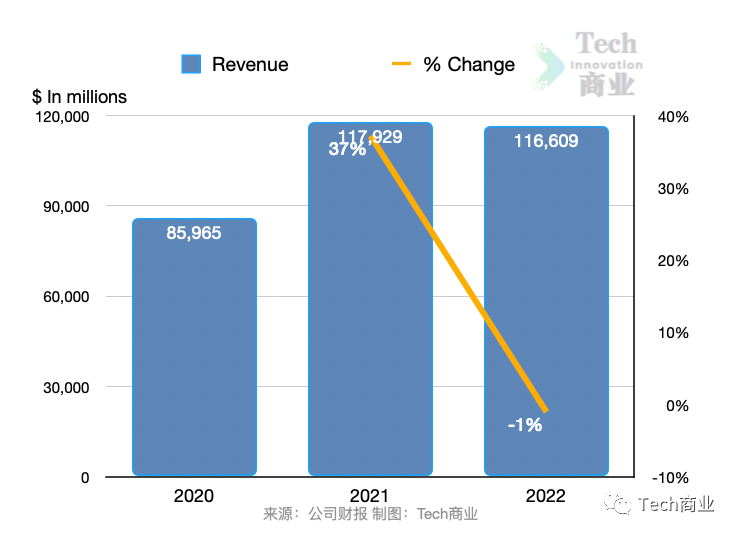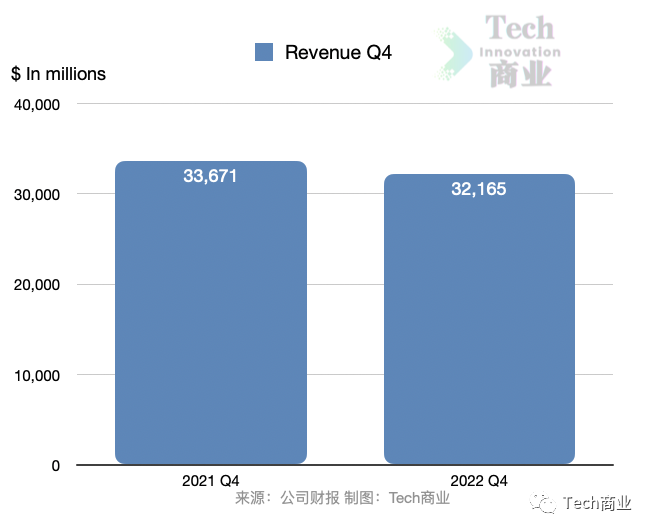 Meta最新财季(2022年Q4)营收为322亿美元,同比2021财年Q4的337亿美元,表现为营收减少4%。