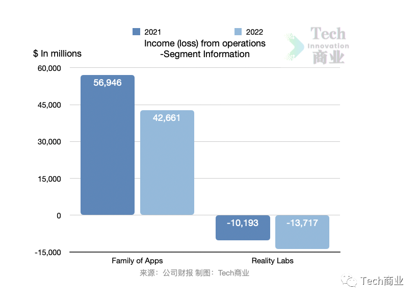 Meta旗下应用系列本财年营业利润为427亿美元,同比2021财年时期的569亿美元,表现为减少25%。虚拟现实实验室本财年营业亏损137亿美元,上一财年同期为营业亏损102亿美元,本财年该项亏损有所扩大。