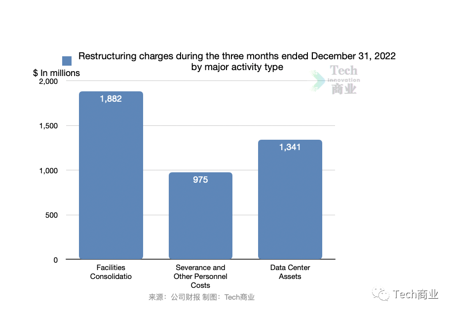成本方面,根据财报Meta公司描述,其于2022年Q4进行了业务和战略调整,从而产生了Facilities Consolidation设施整合(例如转租、终止和放弃经营租赁办公楼)、Severance and Other Personnel Costs遣散费和其他人事费用(例如由裁员产生遣散费)、Data Center Assets数据中心资产(例如取消数据中心项目等)费用。具体包括:设施整合产生费用为18.8亿美元,遣散费和其他人事产生费用9.8亿美元,数据中心资产产生费用13.4亿美元。
