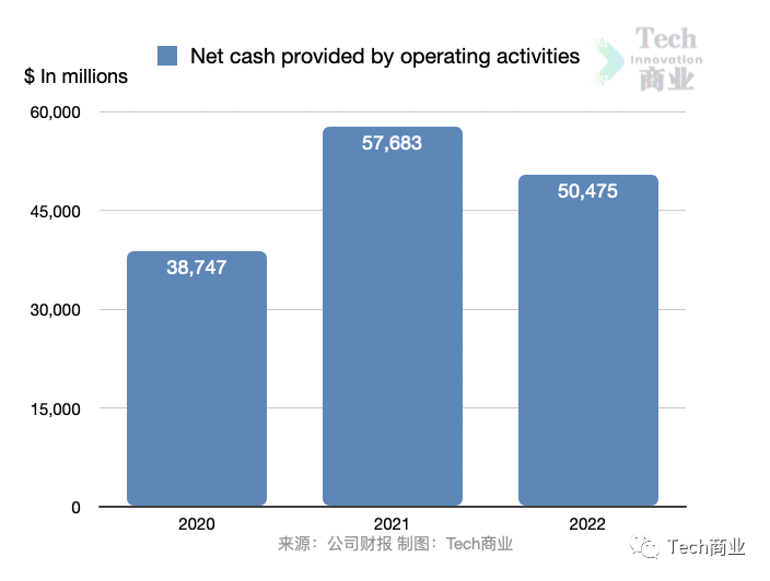 本财年Meta公司经营活动产生现金流为505亿美元,而2021财年该项为577亿美元,本财年经营活动现金净流入有所减少。本财年该项现金流高于2020财年时期387亿美元的表现。