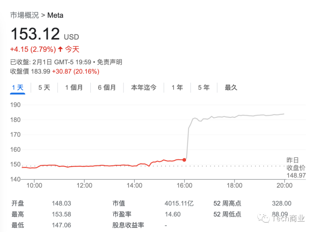 截至发布财报当日交易日,Meta公司股价回升20%,当前市值为4015亿美元。