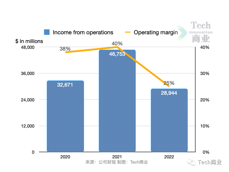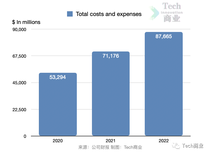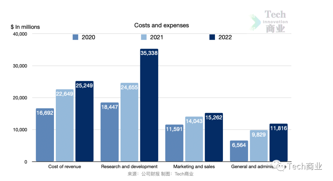 其中收入成本为252亿美元,同比2021财年时期的226亿美元,增加11%。研发成本为353亿美元,同比2021财年时期的247亿美元,该项成本增加43%。营销与销售成本为153亿美元,同比增9%。一般与行政成本为118亿美元,同比增加20%。