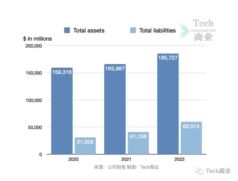 截至本财年Meta公司总资产为1857亿美元,同比2021财年时期的1660亿美元,增加197亿美元。本财年总资产高于2020财年同期表现。总负债本财年为600亿美元,同比2021财年时期的411亿美元,增加189亿美元。本财年负债同样高于2020财年表现。