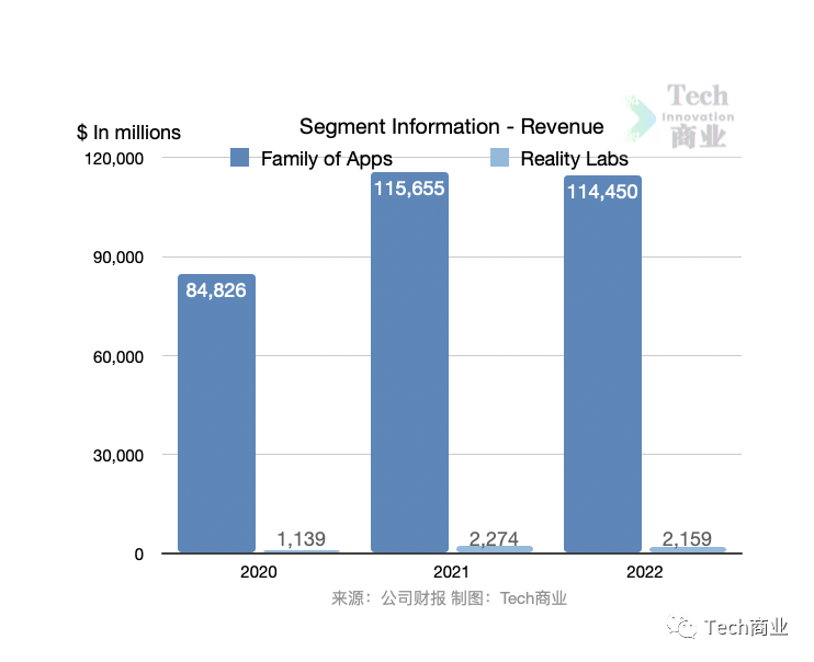 Meta公司营收主要来自两板块,1)App应用系列Family of Apps(包括Facebook、Instagram、Messenger、WhatsApp及其他服务),2)虚拟现实实验室Reality Labs。其中应用系列Family of App本财年贡献营收1145亿美元,同比2021财年同期的1157亿美元,表现为营收减少1%。该项业务2021财年同比2020财年表现为增长。