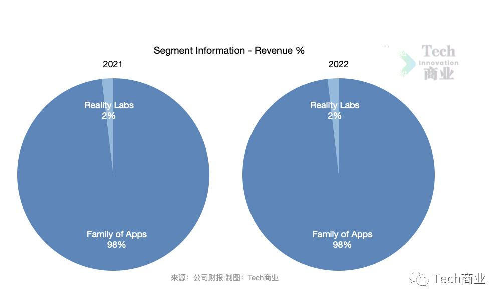 从营收比例来看,Meta两板块业务2022财年占总营收比例与2021财年同期表现为持平,应用系列Family of Apps占总营收比例为98%,虚拟现实实验室Reality Labs占总营收比例为2%。