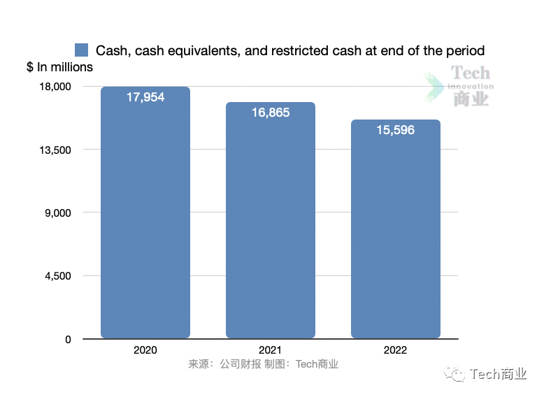 截至2022年12月31日,该公司现金、现金等价物及受限现金为156亿美元,同比2021财年同期的169亿美元,该项现金资产有所减少。本财年与2020财年同期相较,同样表现为该项有所减少。