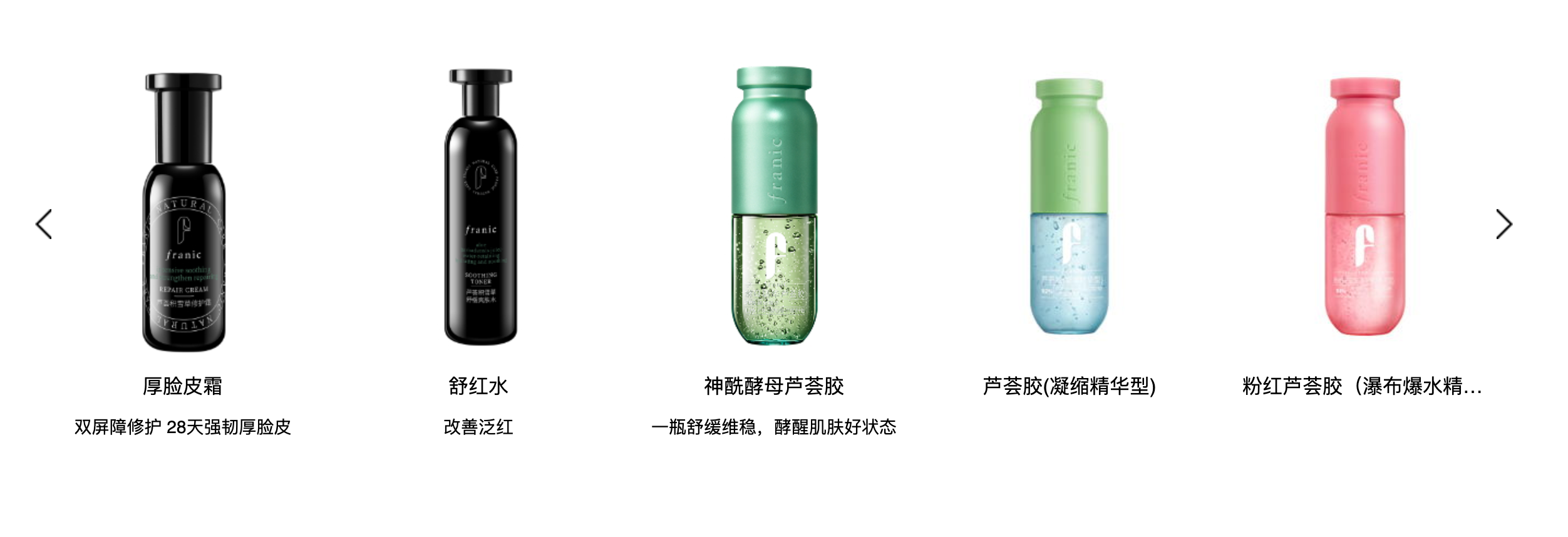 以法兰琳卡为例,其官方淘宝店上已搜索不到法兰琳卡白白霜这个早年的爆款,取而代之的是围绕敏感肌赛道的产品,包括以积雪草为概念的保湿面霜、酵母芦荟胶以及小绿楯强韧霜等。