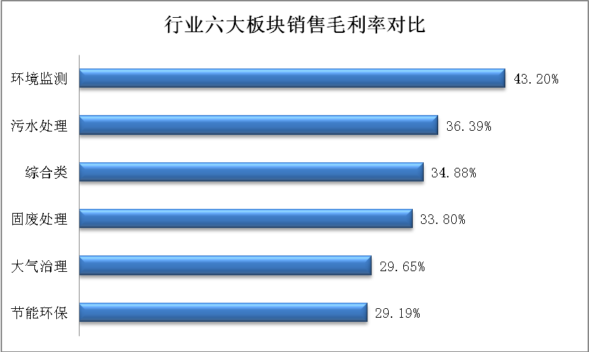 这与行业毛利率有关。若不考虑企业规模权重,仅以简单的行业平均数来计算,环境监测、水处理和综合类板块销售毛利率排前三位,分别是43.20%、36.39%和34.88%。大气治理和节能环保板块的销售毛利率偏低,二者不到30%。