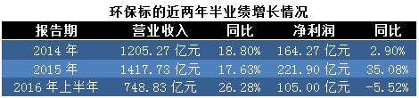论利润,环保行业还在走下坡路。2014年、2015年及2016年上半年归属于母公司净利润为164.27亿元、221.90亿元和105.00亿元,2015年虽然爆发增长了35.08%,但2016年上半年在营收依然加速增长的形势下,归属于母公司净利润却下降了5.52%。